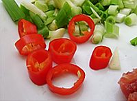 放葱姜蒜和红椒爆香,倒入炸好的茄子,翻炒几下,倒入调料汁