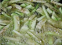 茄子两条去皮,切条(提倡用手撕,我那天太懒了),用盐水泡一会,去去苦味