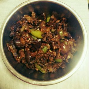 肉快熟时,放入茄子,倒入生抽,翻炒至茄子块基本很软,放五香粉,再炒一炒后放入尖椒,开始进一步翻炒。