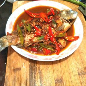 汤开始变白加入干辣椒,酱油,料酒,剁辣椒煮一分钟昨左右