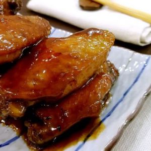 鸡翅夹起装盘,把锅里的浓汁浇在上面。
