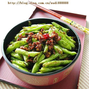 锅热后多放些油烧热,下四季豆过油至表面起皱捞出滤去油(四季豆不吸油,不必怕过油会吸收过多的油);