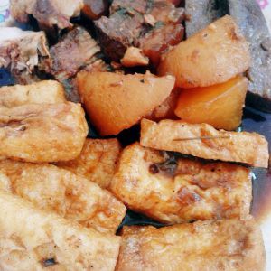在鸡翅鸡肾放入后接着可以把油豆腐和面筋放进去了,因为这两个东西很容易熟而且好入味。