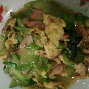 把香肠放进锅中翻炒,再把木耳放进去稍微加点儿水,热透加黄瓜继续翻炒快熟时加进鸡蛋
