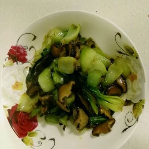 调中火放入葱和香菇条,煸炒至香菇有点收缩,注意葱不能焦。
