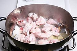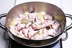 倒入开水没过猪蹄2/3处,用大火将汤汁烧开。