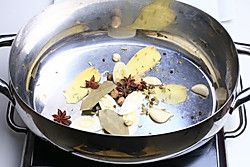 锅烧热放入少许油,投入葱、姜、蒜、花椒、香叶、砂仁、豆蔻、八角、小火煸香。