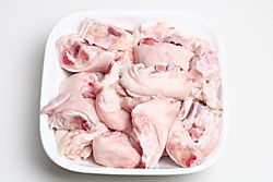 将猪蹄剁小块后,放入清水里泡透换2次水,放清血水。