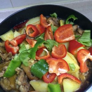 翻炒 加入土豆 青红椒 适量水加盖焖煮二十分钟 忘了拍成品图