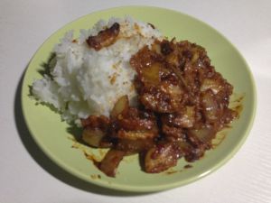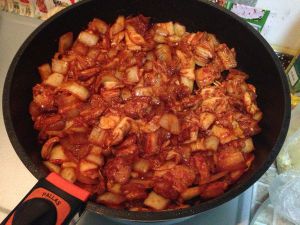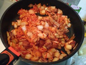 先放入洋葱,和肉一起炒香,洋葱略显黄之后导入辣白菜翻炒均匀。
