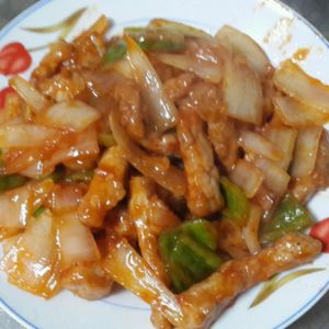 锅里留少许油,翻炒青椒和洋葱,然后放入炸好的肉略炒几下。倒番茄酱一大勺,少许糖和醋,番茄酱、糖、醋的大概比例是5:2:1。最后大火将调料炒匀即可