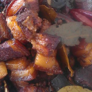 放调料,姜片,八角,花椒,桂皮,稍多,胡椒,丁香,荜葧,肉蔻,香叶少量,炒一会加醋,酱油,根据个人口味加入干辣椒。