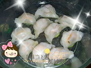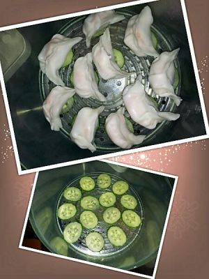 蒸屉中放黄瓜片或胡萝卜片(防止沾),放入包好的虾饺,开始蒸