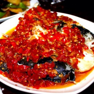 蒸:盘底铺上些葱姜片,放上鱼头,鱼皮朝外,凉水下锅蒸,锅开后五分钟停火,将蒸出的腥汤倒掉,然后将备好的剁椒均匀的铺在鱼头上重新入锅蒸15分钟即可