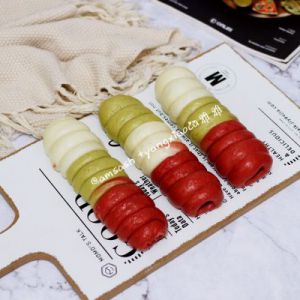 每个颜色的面团都分割成成平均的8等份,用保鲜膜盖住以防表面变干,松弛20分钟,一定要松弛到位,才可以进行下一步的操作