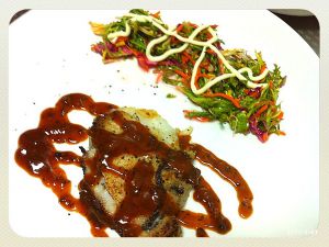 让后配上爽口菜 最后把现成的牛排酱随意挤上一点 即成