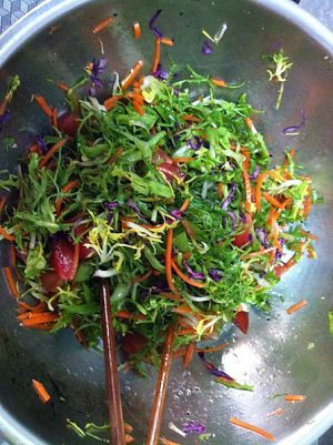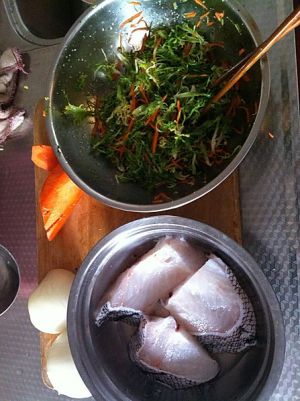 将鳕鱼洗净 红萝卜苦苣菜 进行调伴 备用