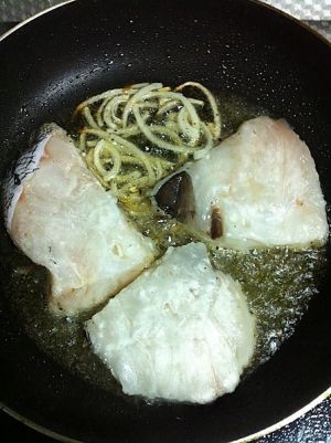 鳕鱼不用腌制 直接可以放在锅中煎 先放点黑花椒碎在油里煎香 放鱼要煎到两面焦软 最后倒入一点红酒 小火收汁