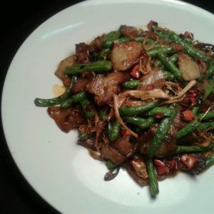 3,留少许油炒香葱姜蒜,辣椒,郫县豆瓣,入肉煸干,再入刀豆,黄花菜,加少许生抽,盐,味精大火翻炒起锅。