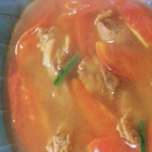 烧锅下油,放入姜片排骨,攒入绍酒加入清水,调入精盐、胡椒粉,煮至熟透,再放入番茄煮片刻,散入葱花即可。