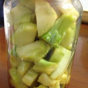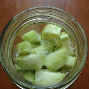 入罐,撒一茶匙盐,摇晃均匀,腌个一小时后,把瓶子里出的水倒掉。可再等会若再出水亦倒掉,防止太咸。