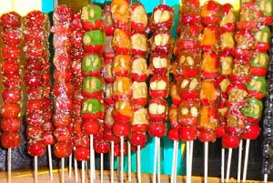 马上把穿好的半成品冰糖葫芦一个个在冰糖水中滚动一遍,然后摆到木板或桌子上,最好小心粘上!!!