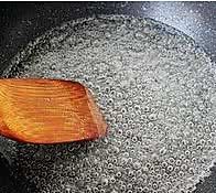 接着,将冰糖放入锅中中火融化.直到小泡泡为止.