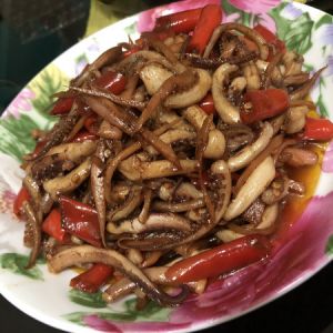 泡姜泡海椒分别切丝,起油锅烧热,先煸炒泡椒泡姜,炒出香味后放沥干水的鱿鱼段。倒入老抽上色,小火焖几分钟入味。即可!