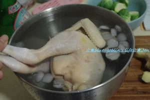 老抽,酱油,柠檬叶,香葱,姜,盐,玫瑰露酒,烧一锅足够没过鸡的水,把过了 冰水的鸡放到里面,再煮3分钟,然后关火,焖30分钟