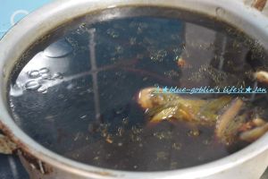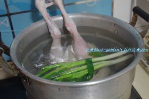 烧一锅热水加入葱和姜,煮到沸腾,然后拎着鸡脚,大头朝下放进去,烫3分钟