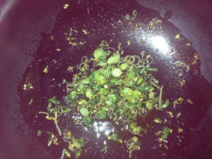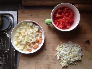 土豆和一部分蒜片用热水煮熟,切两片小白菜叶备用