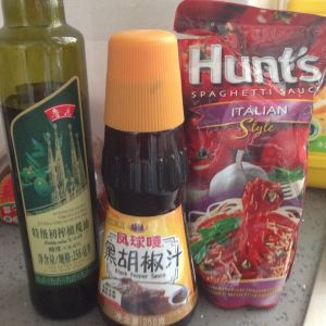 橄榄油,黑胡椒汁,意大利面酱,适量加入锅中