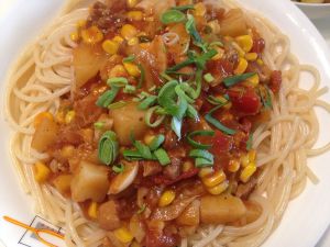 意大利面煮好出锅,用适量橄榄油搅拌,浇上做好的酱汁