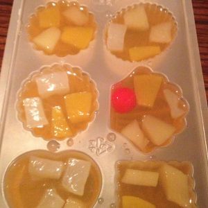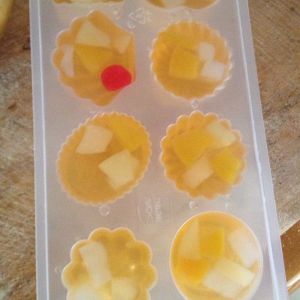 在模具里放好果肉丁,我用的什锦罐头的果肉,然后将冷却到三十度左右的水放进去,入冰箱冷藏四小时以上。