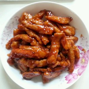 架油锅,油锅里起小泡泡时就下锅炸,中小火炸。一条条放入,以免粘连。待全炸好后,再倒入锅中复炸。