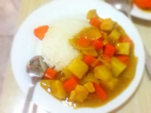 炖十分钟左右放入洋葱和鸡肉,再炖一会。当胡萝卜和土豆煮熟后,关到最小火,一块一块放入咖喱,注意搅拌匀,放入适当的盐。