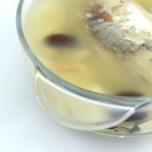 将两面煎黄的鲫鱼、汤料、豆腐和姜片一起放入砂锅或陶锅中,倒入6~8小碗水,用大火煮开,然后调小火煲1小时左右,起锅前放适量盐调味即可。