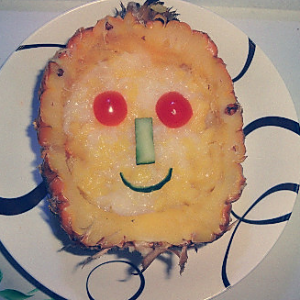准备一个菠萝,家里做可以用熟一点的菠萝,从菠萝三分之一处切开。