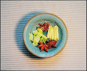 花椒大料备齐,锅内放油,先将它们丢入锅中炒香后,再把鸡块放进去翻炒,然后把炒好的鸡块放入旁边的煲中,煲要提前放入清水、榴莲壳、榴莲籽、黄芪、当归,开火煮上。