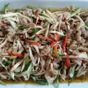锅烧热,放菜油80ml ,烧到6---7成油温,放姜+蒜+花椒+泡椒下去炒香,小火。然后放入码好味的肉丝炒。肉丝下入过后可以开大火,放酱油,放杏包菇(杏鲍菇要在开水中略烫一下,捞出滤水放凉),火大炒。