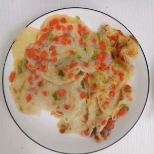 加入切好的香肠丁、青椒丁和洋葱丁。