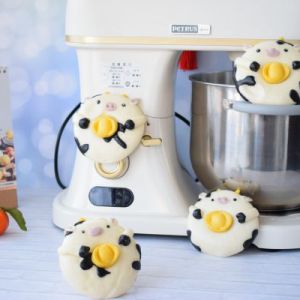 每个元宝6克黄色面团,牛角0.3克/个,鼻子1克/个,眼睛用1丢丢黑色面团,牛前蹄用白色面团搓长条一头包上一点黑色面团,所有配件都用小毛刷刷点清水粘上即可。