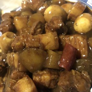 锅里放入油葱姜八角桂皮香叶炒香辣椒后加入肉炒均匀后加入白糖红烧酱油十三香盐老抽翻炒、后加入水放入高压锅中40分钟、后放入土豆过一会在放入鹌鹑蛋、土豆熟后放入鸡精调味在放入淀粉就好了