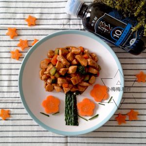 待鸡胸肉丁炒熟,淋入步骤六的料汁,焖煮片刻,收汁。