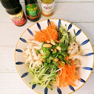 黄瓜洗净擦丝,胡萝卜去皮擦丝,鸡脯肉煮熟,撕吃丝状
