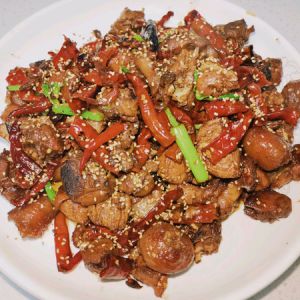 起锅烧油倒入鸡块翻炒至鸡肉变色后加入鸡肉继续翻炒,炒干水分。
