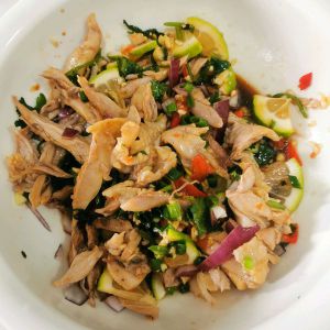 倒入配料,加生抽、醋(白醋米醋更好吃)、白糖、香油,一点点盐、味精。拌匀