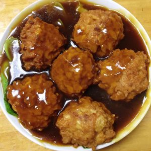 油锅烧热,大肉丸下锅,中火炸金黄色,出锅控油。(刚开始不要翻动狮子头,炸的过程可以用勺子不停的往狮子头上浇油,等定型之后就可以翻动了,这样不会散。)