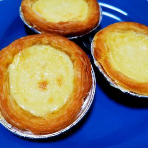 蛋挞皮解冻,把蛋挞水混匀后过滤,倒入蛋挞8分满