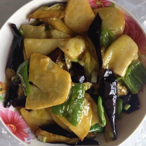 茄子 土豆倒入锅中 翻炒几下 加入味精 葱花。出锅喽!